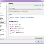 이클립스를 쓰다보면 자주 애용되는 자동정렬(Ctrl + Shilf + F) 기능. 하지만 넓은 모니터를 쓰다보면 너무 짧게만 정렬되서 오히려 가독성이 떨어지는 경우가 종종 있습니다. 이클립스에서는 이 길이를 조절하는 기능을 제공하고 있습니다. 우선 이클립스 상단 메뉴의 Window -> Preferences -> Java - > Code Style -> Formatter 에 갑니다. 그럼 위와 같은 창이 뜨게 됩니다. 여기서 New 를 눌르면 아래와 같은 New Profile 이라는 창이 뜨고 Profile name을 입력한 후 OK를 누르면 아래와 같은 창이 뜹니다. 여기서 Line Wrapping 탭에 Maximum line width를 원하는 만큼 늘려주시면 됩니다. 초기값은 80이고 저는 150으..