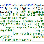 전에 SyntaxHighlighter를 Tistory에 적용시키는 글을 포스팅한 적 있다. [Programming/Web Language] - SyntaxHighlighter 티스토리에 적용하기 Tistory 글쓰기 기능 중 인용구를 이용하여 code:java 식으로 적기만 하면 바로 적용되는 간편한 방법이었다. 허나, 금일 갑자기 오류로 인하여 코드들이 개행 태그마다 abp라는 속성이 붙어서 한줄로 이상하게 출력되기 시작했다. 왜 그런지 이유를 알아봤더니, 티스토리가 어떤 이유에서인지는 모르겠지만 내부에서 모든 태그에 abp라는 속성을 가지고 일련번호를 달고 있었다. 그래서 급히 이 문제를 해결함과 동시에, 위지윅 에디터에서 Tab키를 누르는 것도 코드에 반영되도록 코드를 수정하여 공개한다. 30번째 ..